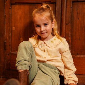 Diese Koko Noko Bluse in Off-White ist ein Traum für jedes Mädchen! Der Kragen und die gestickten Blumen verleihen dem Shirt einen bezaubernden, romantischen Look. Die goldenen Knöpfe sorgen für einen Hauch von Luxus, während die elastischen Bänder an den Ärmeln und am Saum für eine perfekte Passform sorgen. Diese Mädchenbluse aus weichem Musselin bietet nicht nur Stil, sondern auch Komfort für jedes Abenteuer.