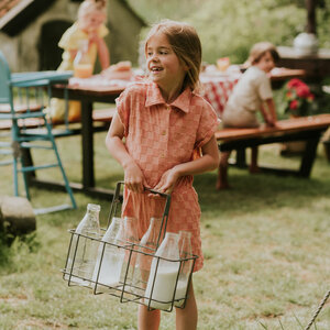 Dieses wunderschöne rosafarbene Kleid von Koko Noko (Terracotta) ist perfekt für den Sommer. Es besticht durch ein trendiges Karomuster und goldfarbene Knöpfe vorne. Dank des elastischen Bundes und der hochgekrempelten Ärmel bietet es sowohl Komfort als auch Stil. Hergestellt aus 80 % Baumwolle und 20 % Polyester, fühlt es sich wunderbar weich an. Ein perfektes Koko Noko-Kleid für fröhliche, sonnige Tage.