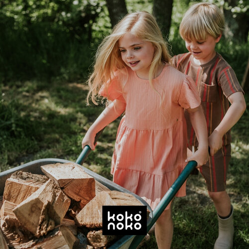Koko Noko girls dress Nala pink. The dress with short sleeves is straight fit and is made of biological cotton. The dress has an elastic waistband with laces. Press studs at the shoulder for small sizes up to 86.