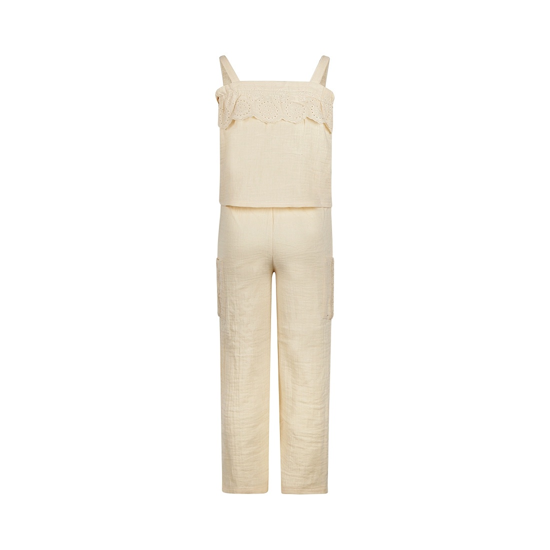 Koko Noko set for girls. The set consists of a spaghetti top and wide leg trousers. The girls' shirt has playful ruffles on the front. The wide leg trousers have a nice detail on the pockets. The set features a fun textured fabric.