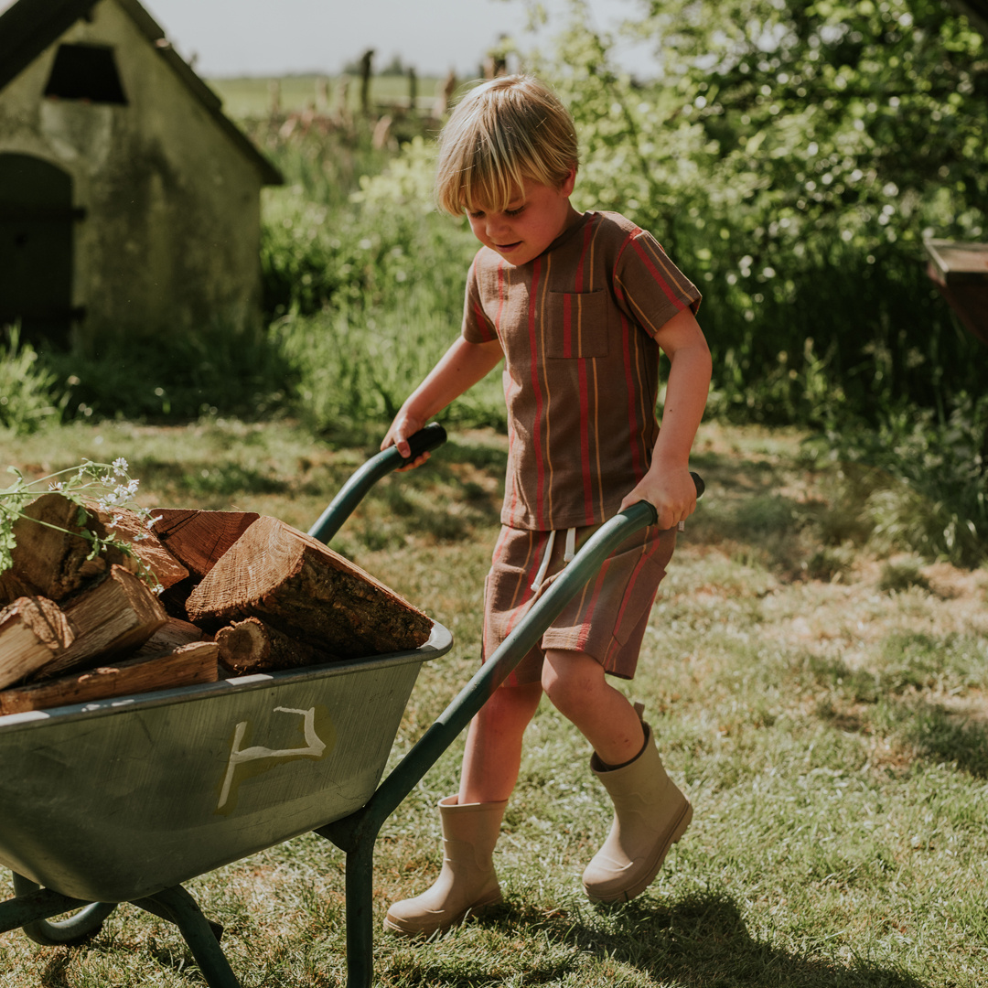 Dit Koko Noko T-shirt voor jongens is een trendy en comfortabele keuze voor de warmere dagen. Uitgevoerd in een warme bruine kleur met opvallende verticale strepen in oranje en geel, geeft het direct een vrolijke en eigentijdse uitstraling. Gemaakt van 100% zacht katoen, voelt dit T-shirt heerlijk aan op de huid en biedt het optimaal draagcomfort voor alle zomerse avonturen. Het borstzakje voegt een speels en praktisch detail toe, perfect voor kleine ontdekkers.