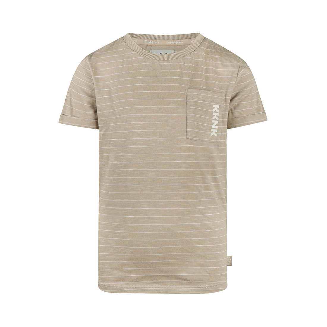 Dit Koko Noko T-shirt voor jongens is uitgevoerd in een zachte zandkleur en heeft een trendy long back pasvorm. Over het hele shirt lopen horizontale, dunne witte strepen die zorgen voor een frisse, zomerse uitstraling. Op de borst zit een zakje met de afkorting KKNK subtiel verwerkt. Gemaakt van 100% katoen voor optimaal draagcomfort en ademend vermogen. Een veelzijdig item voor elke zomerse garderobe.