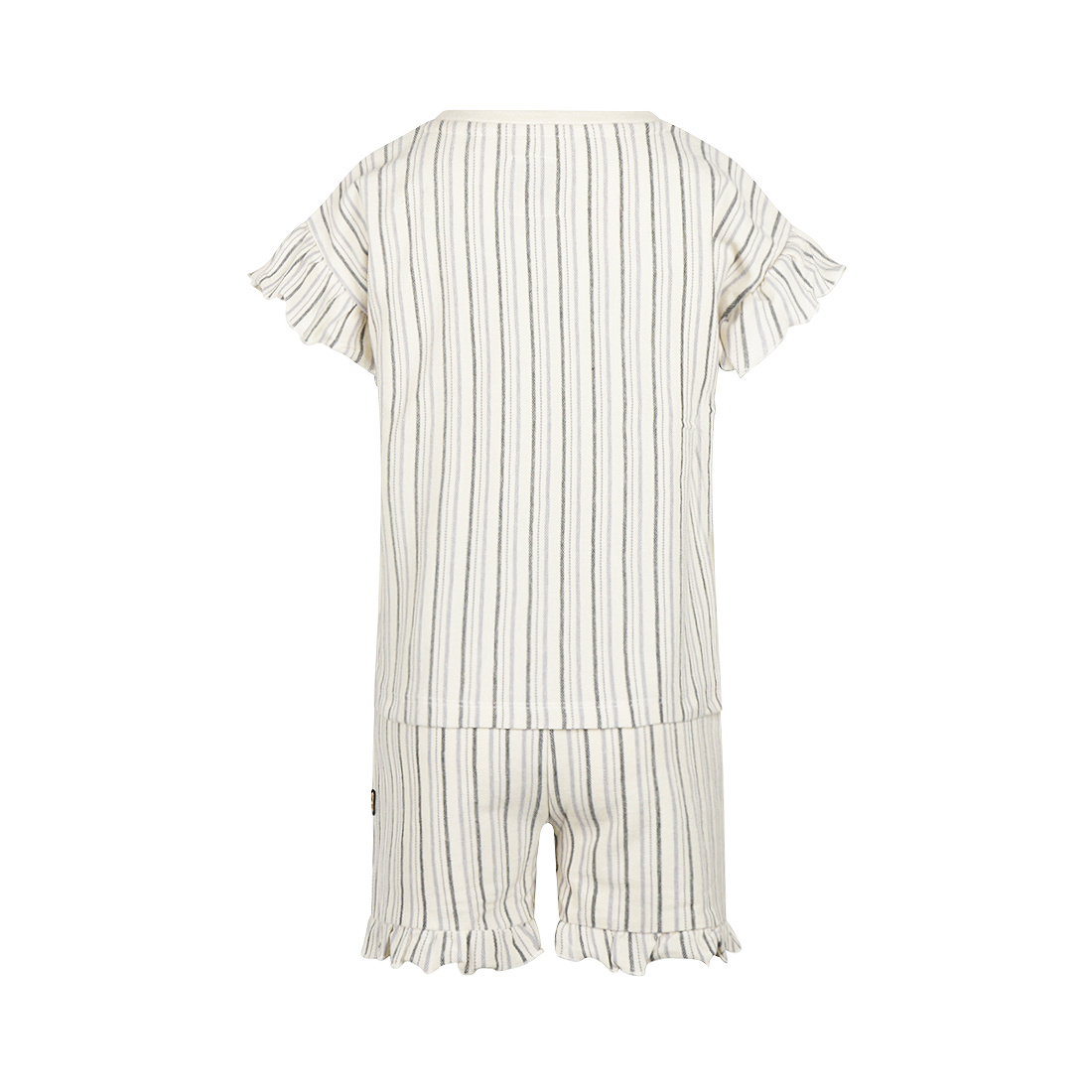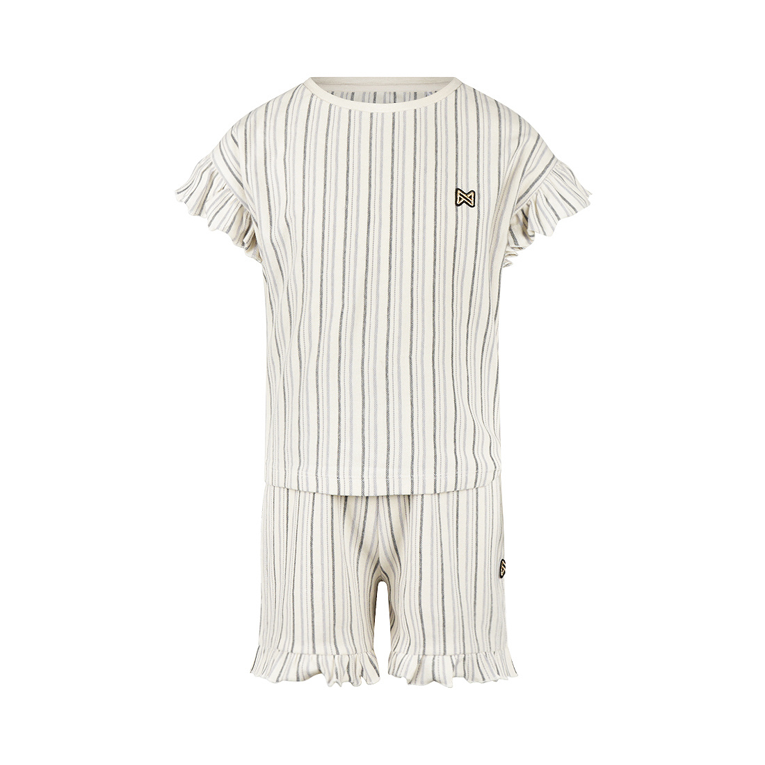 Deze Koko Noko 2-delige set voor meisjes is een vrolijke en comfortabele keuze voor de zomer. De set bestaat uit een loose fit T-shirt en bijpassende short, beide in off white met verticale strepen in donkergrijs en paars. De ruches op de mouwen en aan de pijpen geven een speelse touch. Gemaakt van 100% katoen, biedt de gestreepte co-ord set luchtigheid en comfort op warme dagen, perfect voor zorgeloos spelen.